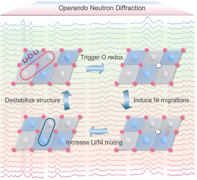 超高镍三元层状氧化物LiNixM1−xO2 (M=Co, Mn, Al等,x ≥ 0.9)因其较低的成本和较高的能量密度,已成为非常有竞争力的动力电池正极材料。然而,超高镍材料中镍含量的升高,也使得Li/Ni反占位缺陷这一关键科学问题更加严重。Li在过渡金属层中的混占位,会形成非键态O2p轨道(也即Li-O-Li构型),在高压下激发氧阴离子的氧化还原行为。氧阴离子电荷补偿在提高材料能量密度的同时也带来一系列问题。例如,氧气的释放、过渡金属的迁移、不可逆的相转变等,这些最终限制了材料的实际应用。因此,阐明Li/Ni反占位缺陷和阴离子氧化还原之间的动态耦合过程对于超高镍材料的结构优化至关重要。