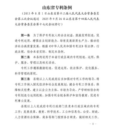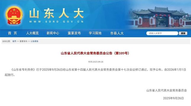 《山东省专利条例》已于2025年9月26日经山东省第十四届人民代表大会常务委员会第十七次会议修订通过,现予公布,自2026年1月1日起施行。